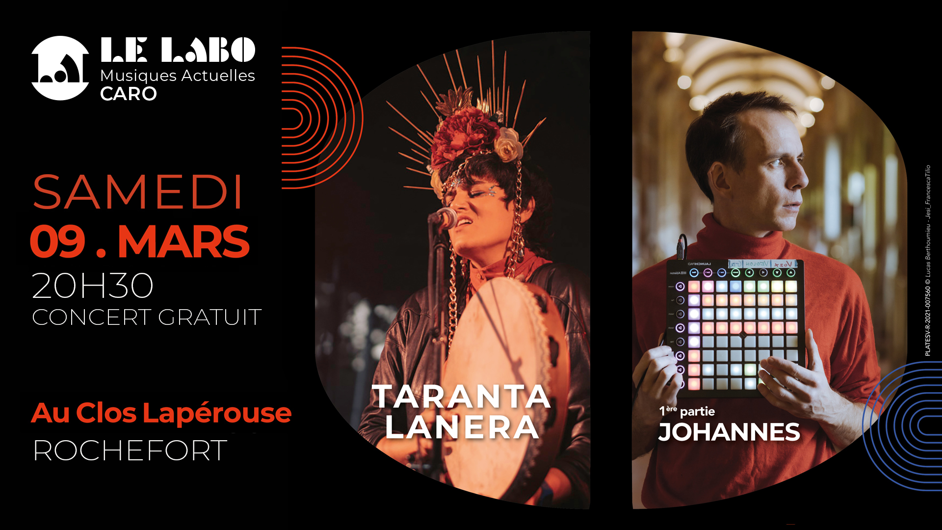 Samedi 9 mars 2024, le trio féminin Taranta Lanera embarquera le public du Clos pour un voyage onirique sur les rythmes de la tarentelle antique de l'Italie du sud. La chanteuse italienne Mari Lanera bouscule les normes et entraîne le public dans un concert qui mélange instruments traditionnels et pratiques électroniques. Johannes multi-instrumentiste assurera la première partie.
