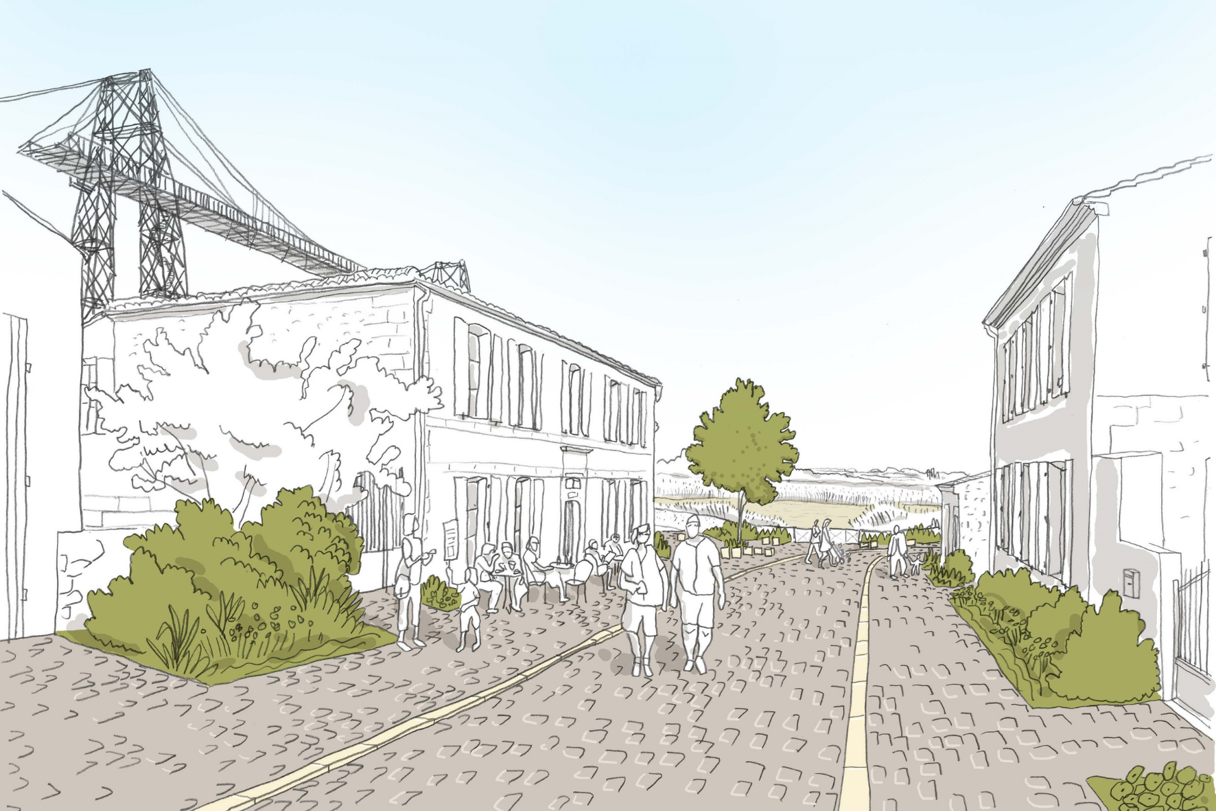 L’ensemble sera en pavés Napoléon sciés. Il s’agit de prolonger le parvis du Martrou et de conforter le seuil de l’ancienne cale et de la Maison du Transbordeur. Les trottoirs en pavés mettront à distance la voiture des façades tout en donnant plus de place aux piétons.