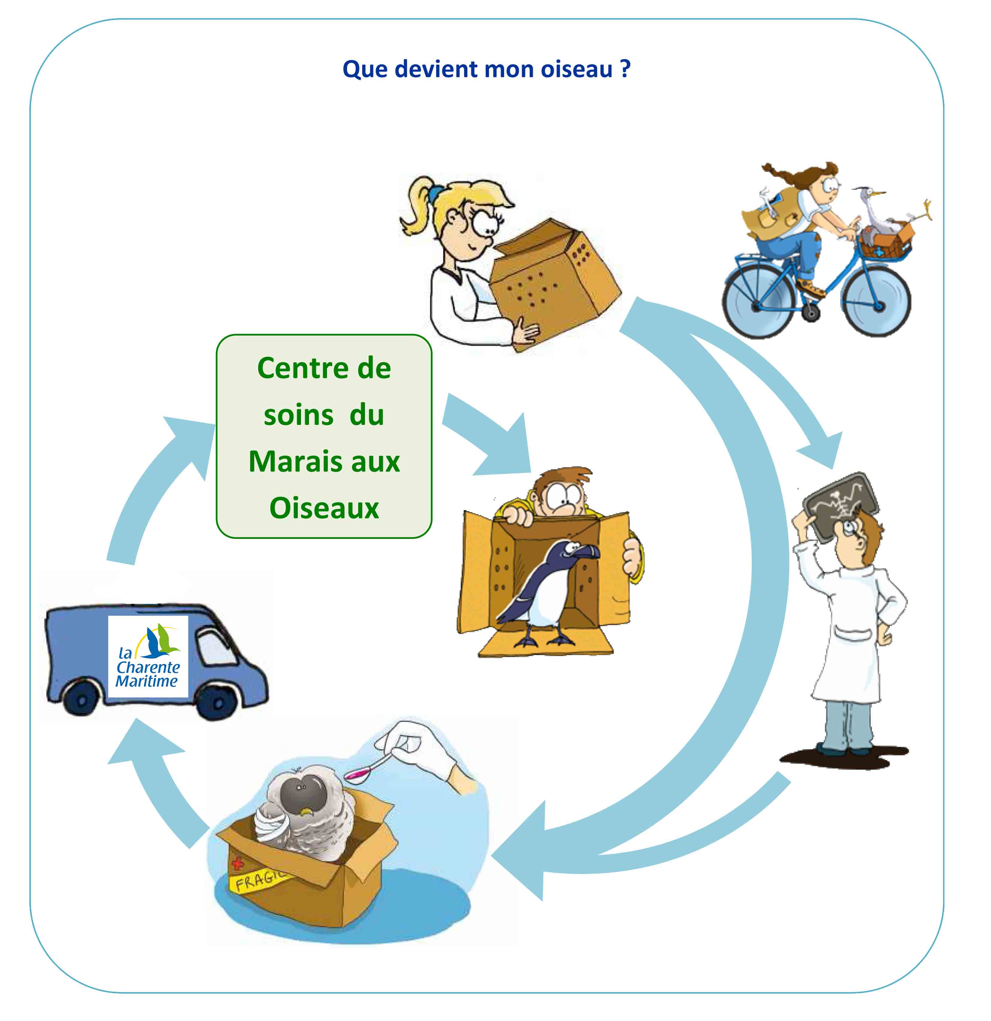 En cas d’impossibilité, l’animal peut être apporté à Espace Nature où il sera pris en charge par l’équipe de la Ligue de Protection de Oiseaux (LPO) avant d’être acheminé par le transporteur du département de la Charente-Maritime vers le Marais aux oiseaux.