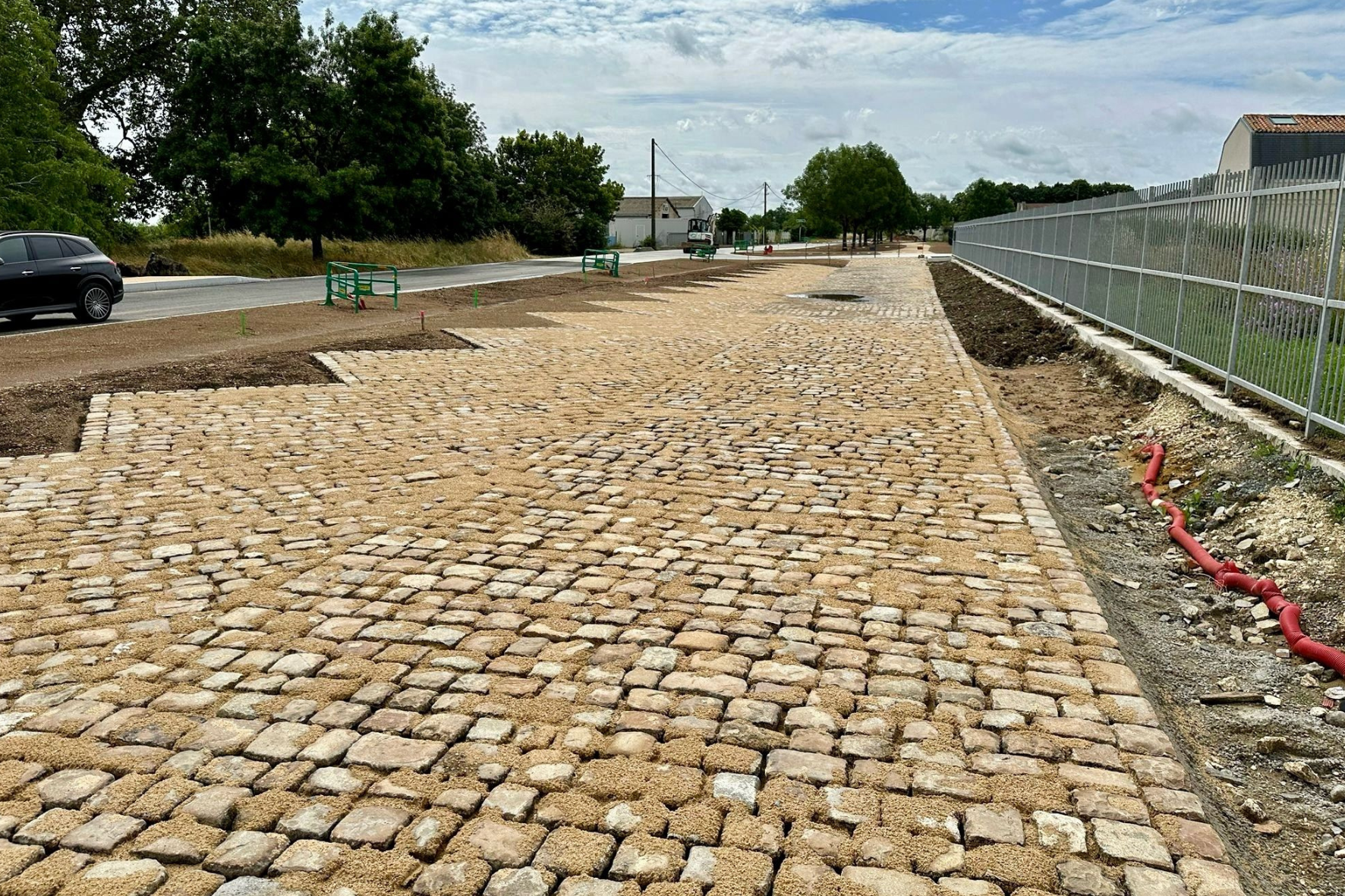 Triés et déplacés, les pavés sont posés à l'ancienne sur un lit de sable avec des joints en sable sur les surfaces de circulation et engazonnés pour le stationnement. En automne, les stationnements seront accessibles, le temps que la pluie permette au sable de bloquer le pavage.