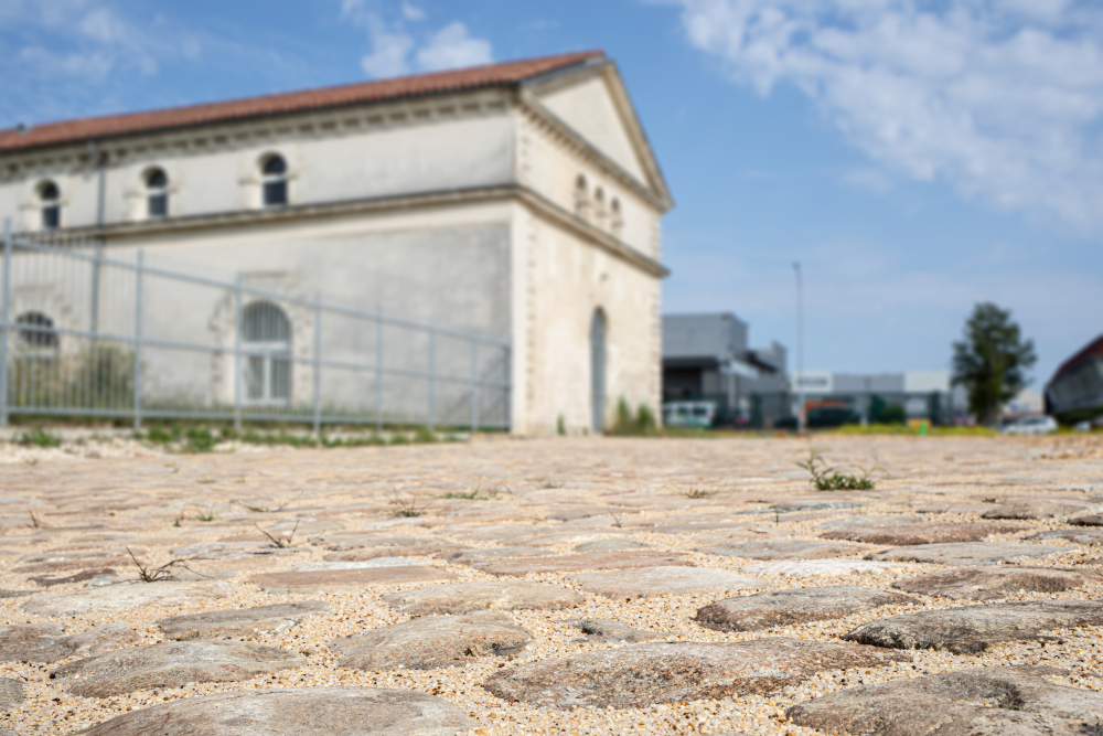 Pour les conserver le projet a été adapté et le niveau des voiries adjacentes a été abaissé de 30 cm. Tous les stationnements ont été réalisés avec ces matériaux anciens qui proviennent du site.